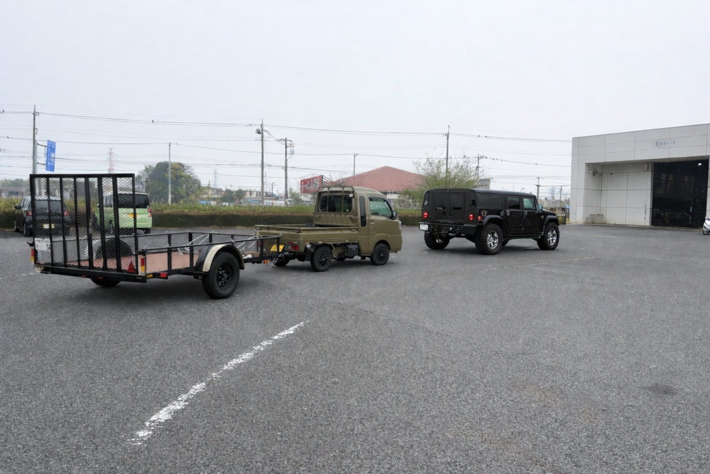 今回のトレーラーは750kg以下のトレーラーだったので社用車の軽トラで行ってきました。軽いので引っ張るのは問題無いのですがトレーラーの車幅が245cmあるので軽トラの車幅だと道の真ん中を走行してないと結構危ないです。気が抜けません。                                                            幅の広いアメ車で行った方がよっぽど楽でしたね。