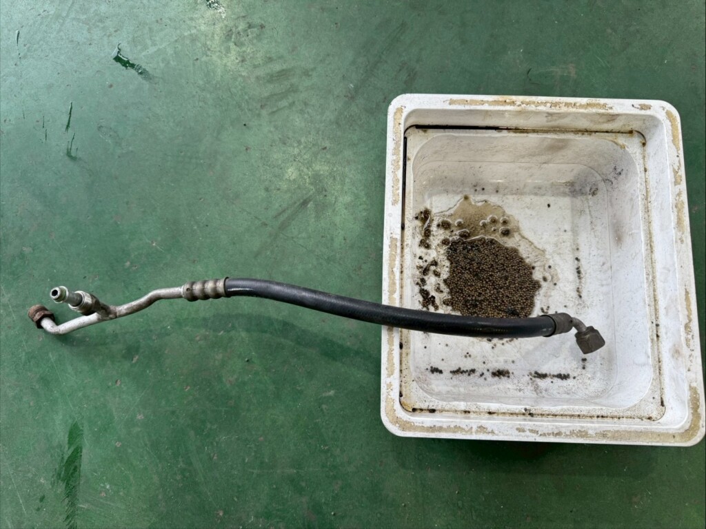 レシーバータンクの交換、エキパンの交換、AC配管、ホース内の活性炭を綺麗に掃除して取り除き、ガス補充しガス圧、漏れ、エアコンの効きを確認し作業完了です。